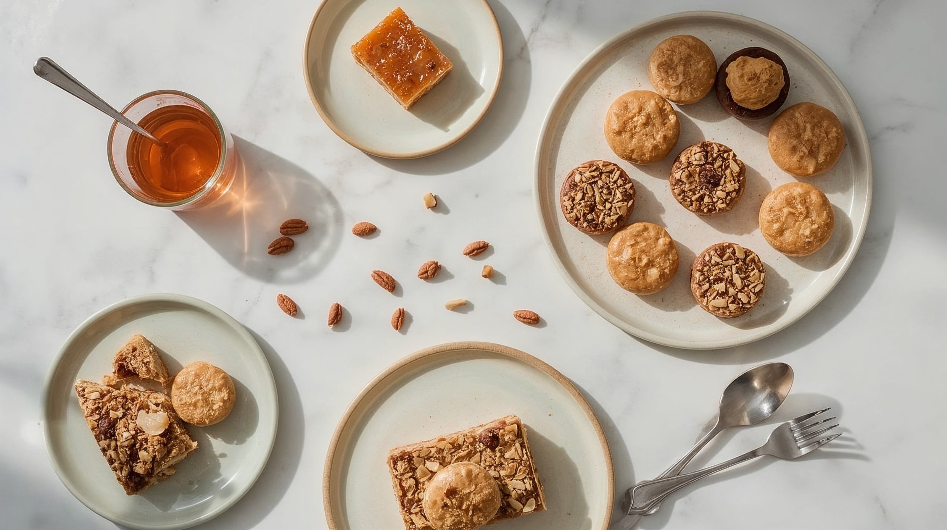A clean, minimalist flatlay of beautifully plated Solferantine treats on a marble surface, designed to convey freshness, simplicity, and contemporary style.